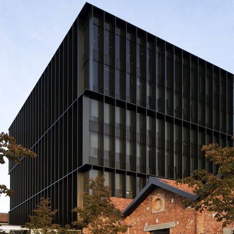 Inside the regular layout of solid structures and empty spaces, a new six-storey tower closely interacts with the old construction: characterized by a glass façade covered with a regular pattern of sunscreens, the new building breaks down the site’s symmetry and tends to draw together all the different functions.