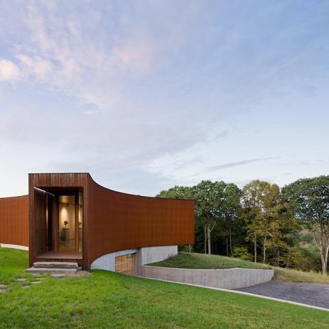 The guesthouse brief asked for three main elements: a bedroom, a workroom and a gallery for the two collectors’ art. One simple and highly effective gesture – a Y-shaped ground plan – served to link these elements at isolated points and to define the overall appearance of the guesthouse. The small bathroom, kitchenette and walk-in closet – the latter of which conceals the staircase to the basement and garage – consist of compact, freestanding boxes that simultaneously constitute the rear walls of the bedroom and workroom. In contrast to the galvanized corrugated metal façade of the main house, the guesthouse is a timber structure clad in corrugated corten steel, which rusts over time and so merges unobtrusively with the landscape – particularly in fall, when the foliage of the trees turns into a riot of red and gold.