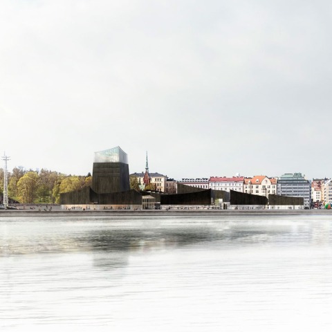 The design comprises a sequence of charred timber pavilions with concave roofs and a tower with the appearance of a lighthouse, which would give visitors views out over Helsinki's waterfront.