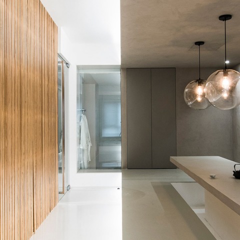 The design of the first floor is developed around the living room and the study room, oak grille and shelves are used to meet the requirements of book collecting, exhibition and display, and to create a sense of layer of semitransparent from outside to inside. The tea room uses gray cement paint combined with a custom-made concrete counter top and table top, in this way the contrast of the grey box and the background will result in a spatial experience of different scales. The same technique is used in the design of the living room and the bedroom. For the basement floor the designer reintegrates the relationship between the sunken garden and the interior space. The bamboo forest in the courtyard creates landscape interactions between interior views and outdoor views. The underground garage has been turned into a bright guest room. A “dome” is used in the living area of the second floor to soften the relationship between the roof and the wall, which makes the interior space soft and full of change.