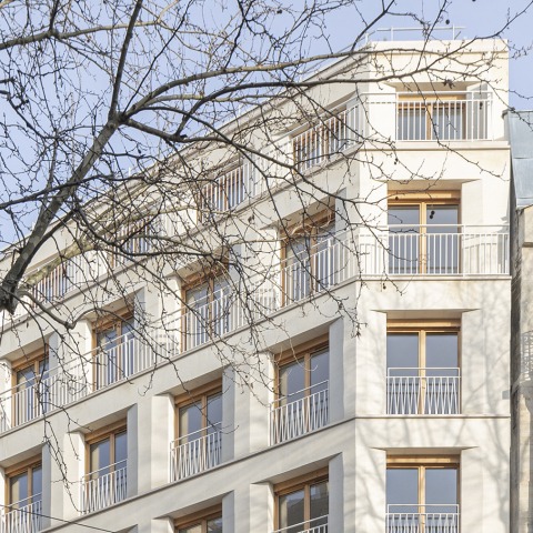 The façade, clad in solid stone on the street side and lime render on the garden side, combined with hemp concrete insulation, forms a breathable envelope that actively contributes to the building’s and apartments’ thermal comfort. These natural materials, known for their vapor-permeable properties, promote the regulation of heat and moisture exchange between the interior and exterior, allowing humidity to escape while minimizing temperature fluctuations. The work on the Noyant stone, with its angles and cornices, emphasizes the effect of a thick façade that shifts with the daylight. Large wooden joinery, wooden shutters, and detailed metalwork give the whole its domestic and urban character.