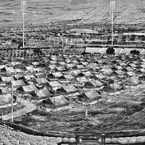 Mosse has scanned significant sites in the European refugee crisis from a high eye-level, creating densely detailed panoramic thermal images. Each artwork has been painstakingly constructed from a grid of almost a thousand smaller frames, each with its own vanishing point. Seamlessly blended into a single expansive thermal panorama, these images evoke certain kinds of classical painting, such as those by Pieter Bruegel or Hieronymus Bosch, in the way that they describe space and detail. They are documents disclosing the fences, security gates, loudspeakers, food queues,