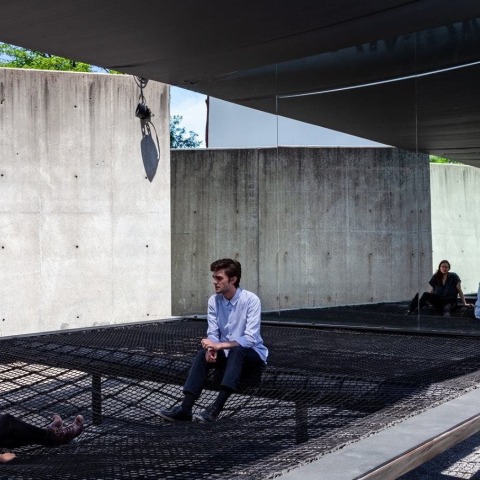 Inspired by the crowd, the street, and the jostle of relationships found in the contemporary city, Hide & Seek enables surprising connections throughout the adjoining courtyards of MoMA PS1 and the surrounding streets. Each of the horizontal structures contains two inward-facing, gimbaled mirrors suspended from a frame.
