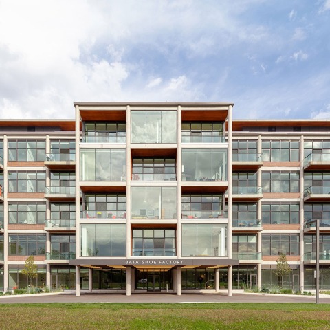 In alignment with Sonja Bata’s vision of the building as a model of sustainable architecture, the renovated factory retains the original 1939 concrete structure, saving close to 80% of the embodied carbon from the original building, while revitalizing its Modernist heritage through new materials and striking design elements. Tenants with a taste for authentic industrial modernist architecture will find much to appreciate here. The original building's waffle slab structure (an innovation that the Bata's brought with them from Europe) and its generous open spans allowed for its conversion into residential units with 12-foot-high ceilings and abundant natural light. The façade features new glazing and brick cladding that echo the factory’s original appearance, with the addition of cantilevered balconies throughout. Wood cladding on soffits and balcony walls soften the exterior's industrial character with natural warmth and a distinctly Canadian flavour. The regular rhythm on the façade is interrupted by the projecting central volume, with recessed balconies that add playful voids to the otherwise planar façade; below this, an entrance canopy with dramatic LED lighting extends outward, welcoming residents & visitors to enter.
