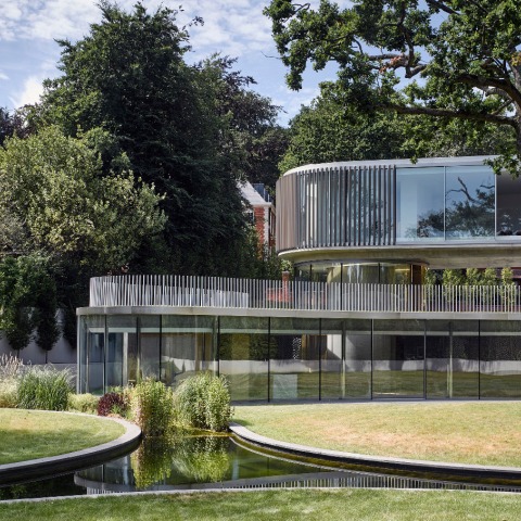 The external landscaping scheme has also been designed by Eldridge London following the same geometries as the house to ensure an holistic composition with the existing oak tree again becoming the focal element. Hornbeam trees to the side and front boundaries screen the site from the street, whilst the garden lawn continues across the street level entrance roof. A stainless steel path set into the lawn merges into the street level roof edge coping which together define the outline of the trefoil plan form of the spaces below. A series of vertical cantilever balusters project from these curving alignments forming a shifting moiréfringe effect as one approaches the building. A cantilevered external stone stair on one side of the building provides external access between the two garden levels, whilst a copse of silver birch trees adds texture and boundary screening to the other side. The landscaping also includes a natural swimming pond, utilising marginal aquatic planting to provide natural filtration and cleansing of the water.