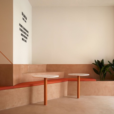 The protagonist of the project is the terracotta color, it covers the floor and the plinth, materialized in microcement. The whole route is doted with details in other colors, for example the orange of the furniture or even the green of the lamps and the vegetation. That vegetation has an essencial paper in this project, and it appears in both the beginnig and the end of the route, located in brick pots.