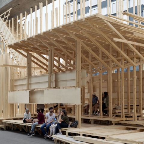 Erected in less than 10 days, the project involved 200 first-year students, who prefabricated all the built elements of the installation in Lausanne and transported them across Switzerland in six shipping containers to Zurich, where they unloaded and re-assembled them as a full-size ephemeral structure.