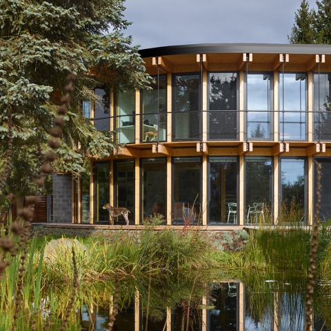 The house is built primarily from a renewable material – wood. The building’s construction respects its shape and reveals the constructional principles literally to the last detail, including steel joints and tie rods that add a finishing touch to the interior and exterior. The built-in furniture has been placed between the beams in such a manner that the rooms resemble ship cabins.