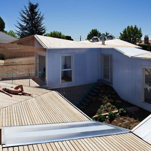 The building is made up of seven wooden-structure modules symmetrically identical surrounding a central court. Each module is dedicated to a different domestic situation, according to its functional needs. The modular structure, as well as the scale of the rooms allows the alteration of this functional logic, serving as a support for possible future layouts.