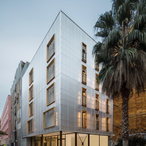 All the dwellings have a minimum of two facades allowing to benefit from cross ventilation. The northwest façade opens onto a patio that contains the vertical nucleus of circulation. The southeast facade, facing a narrow street, consists of vertical wooden openings, Alicante shutters and metal railings, like most of the buildings of the historic center.