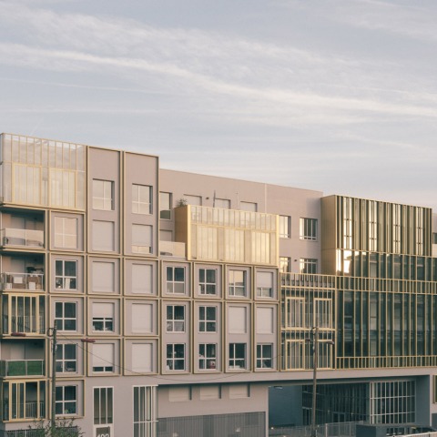 The two interior façades of the homes and offices are set back to ensure that the central part of the block gets plenty of sunlight and offers views of the valley and Greater Paris. The façades at the heart of the block are more restrained and discreet, with masonry spandrel windows to ensure privacy for all.