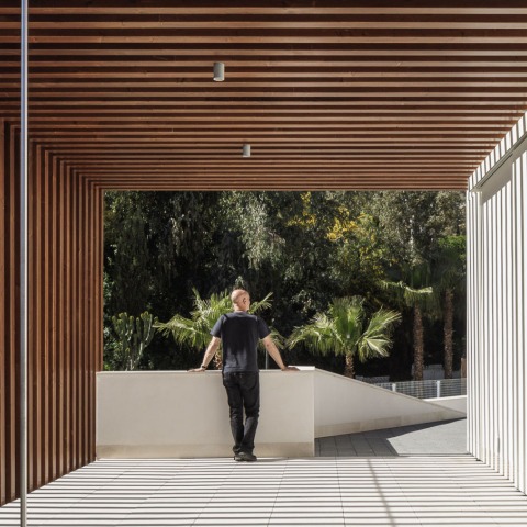 Pergolas of wood decompose the building in its extension in the environment and sift light and views as well as the translucent awnings. They protect from sunlight and encourage stays outside in this so benign climate, providing a more neutral atmosphere of light. Glasses and mirrors carry these sensations inside, breaking any physical limit.