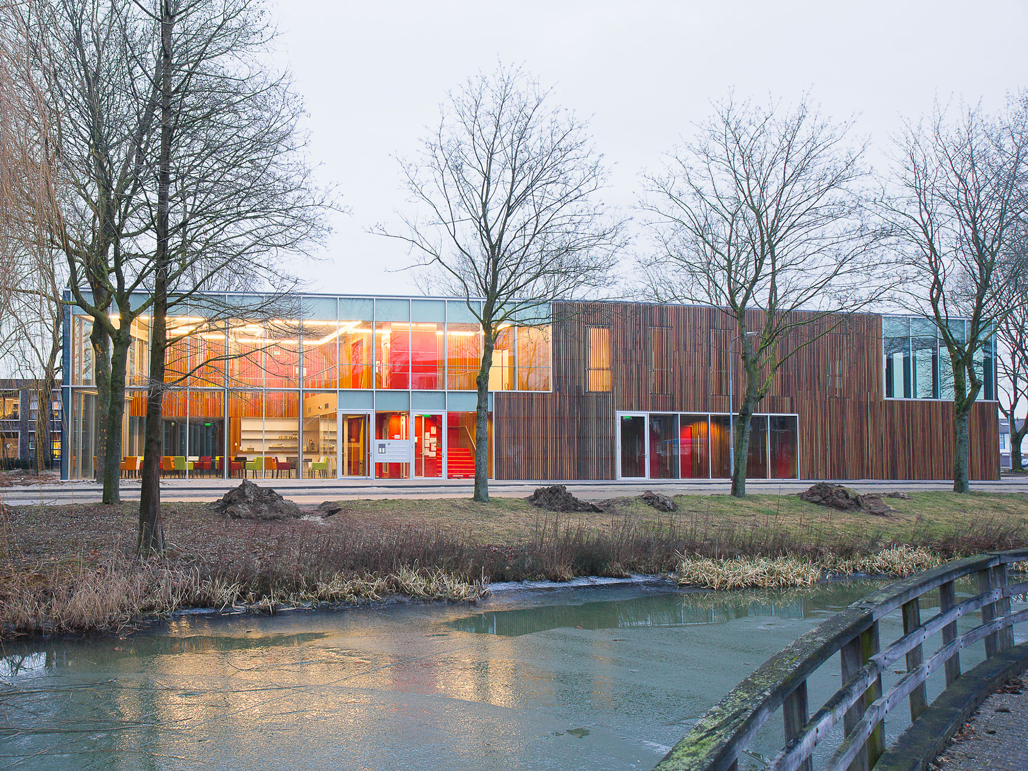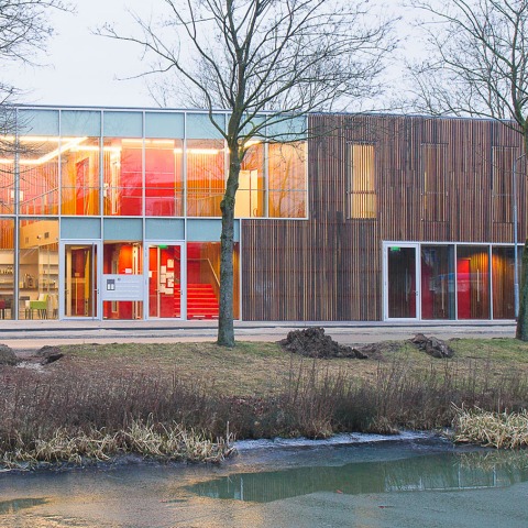 Huis van Droo materialisation - The all-round oriented Huis van Droo is a transparent building, the true façade is the inner-façade of the sports hall. The wooden façade wraps the central hall and all the closed programme elements and is consequently sometimes an outside, sometimes an inside façade. This idea is illustrated with large glass 'holes' in the inner façade of the sports hall where the public interacts with this otherwise closed space. Through this materialization concept the building is always recognizable, though different from all sides. The interiors of the individual users, on the other hand are a very specific match to each public function. The resulting image of the building is a well defined timber (outside) and glass façade in combination with (inside) a variety of characteristic individual interiors matching each specific user.