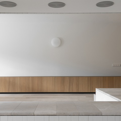 The aim is to give the new spaces as much light, clarity and neutrality as possible. Materials are chosen to multiply, filter and regulate the warmth of light. Thus, framing a neutral canvas, which the inhabitants and their objects fill with colour. The staircase, the heart of the dwelling and the backbone of the spaces, is configured with solid steps made of campaspero stone that contrasts with the light brass handrail. This handrail is the result of a geometric study and reinterpretation of the existing handrails on the outside of the dwelling and in other modern and post-modern architecture in the surrounding neighbourhoods. The floorplan, as an extension of the staircase, is built entirely with the same materials, albeit with 4 different layouts, giving it dynamism, texture and ease of execution.