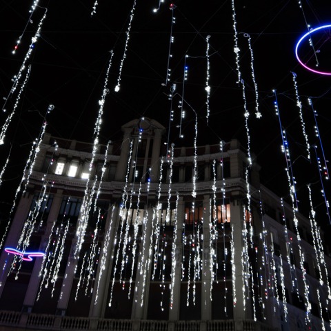 The light installation, denominated Laniakea is a site-specific design by commission of the City of Madrid for Plaza Canalejas and Carrera de San Jeronimo coinciding with the termination of the refurbishment and partial pedestrianisation of the area.