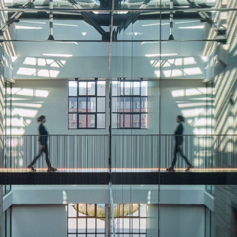 The generosity of the space is underlined by the massive concrete hoppers, which were originally used to store solid fuels. The architects managed to place some of the meeting rooms inside them. The most popular for users so far seems to be the two meeting rooms on the fifth floor. “This is where we took advantage of the location and experimented with glazing in parts of the floor. The result is an iconic space that everyone wants to see. Even those who are afraid of heights,” says architect Antal.