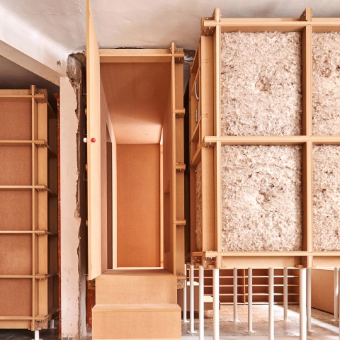 6_Self-construction. A reform exclusively made through "dry" assembly work is proposed that allows the incorporation of "non-experts" in its construction process. As if it were a piece of furniture, the different parts of the house (walls, ceilings, pillars) arrive at the site previously cut using CNC technology from the plans drawn by the architecture studio. Once on site, and simply using standard screws, they are assembled by the architects and the client according to a small instruction manual without the need for specialists.
