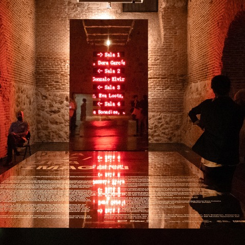 The gist of the project is concentrated in the entrance vault. Two abstract volumes of the same size – one vertical, the other horizontal – welcome the visitor and give the information necessary for them to understand the show and move through it freely, in this way improving upon traditional exhibition schemes in which graphics and architecture operate separately. Meanwhile, in the rooms displaying the works of the artists (organized into four themes: art, sociology, city, politics), whose voices flood the four remaining vaults, there are hardly any of the mirror-clad seats seen in the entrance hall.
