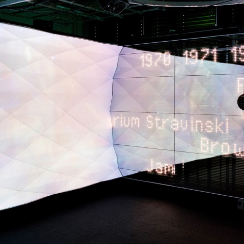 Several principles have driven the multiple design and research choices: from a deep desire to preserve the recordings’ cultural value and content by keeping the original footage unaltered and prevalent, to the enhancement of the immersive experience. To boost the power of the central images, the sidewalls of the installation consist of mirrored panels featuring a LED light grid, which reveals data and visuals about the concerts.