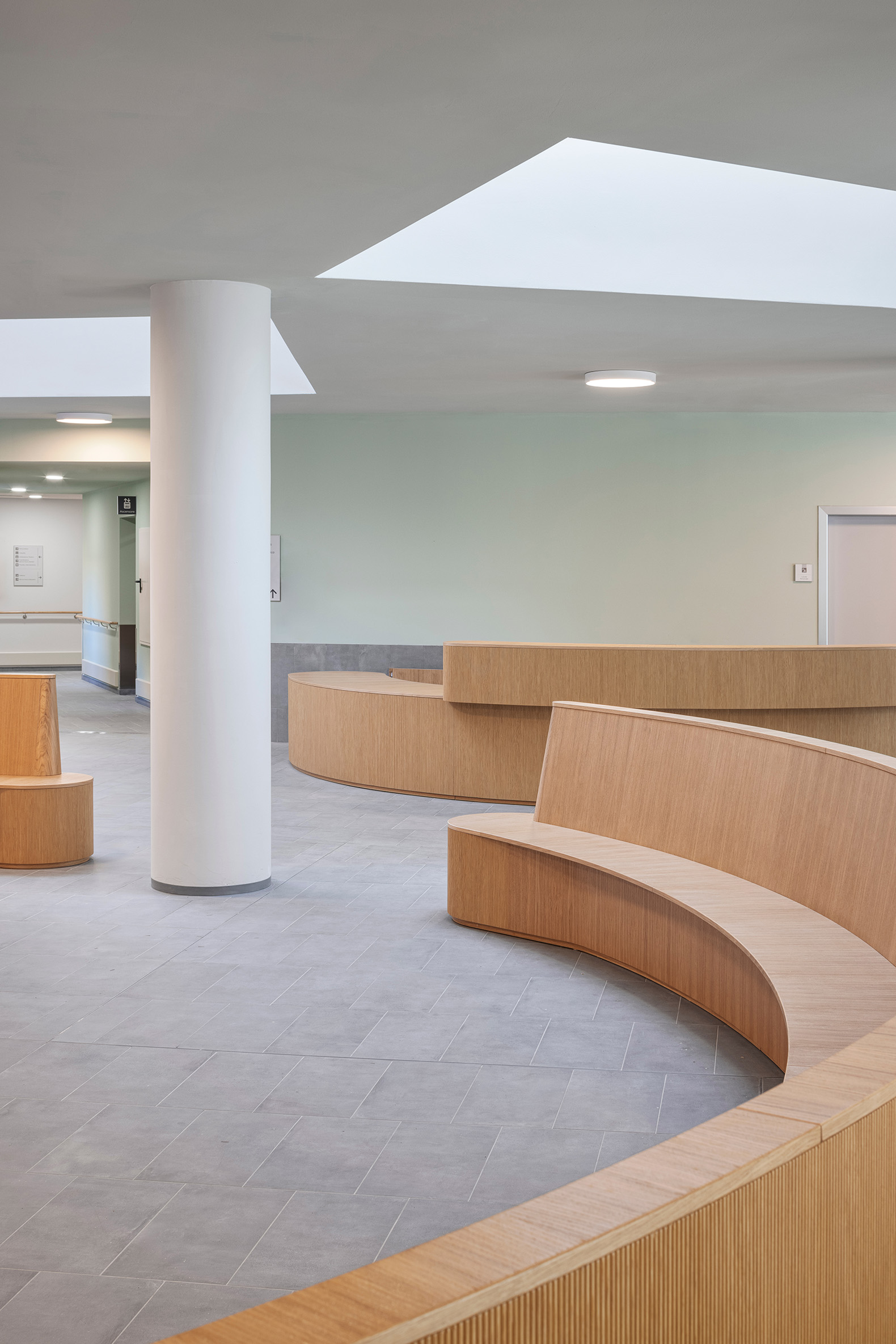 The interiors are structured around a circulation ring that prioritizes livable and accessible spaces dedicated to socialization for the 60 residents and 20 daily guests. The rooms are distributed in three clusters of 20 patients, one of which is specially designed and equipped for Alzheimer's patients. The interior design of the private areas is simple and discreet, but the experience is enriched by carefully considered details: courtyards planted with olive trees and rosemary, panoramic views from rooms and hallways, and a bright lobby illuminated by skylights, featuring sinuously shaped furnishings.
