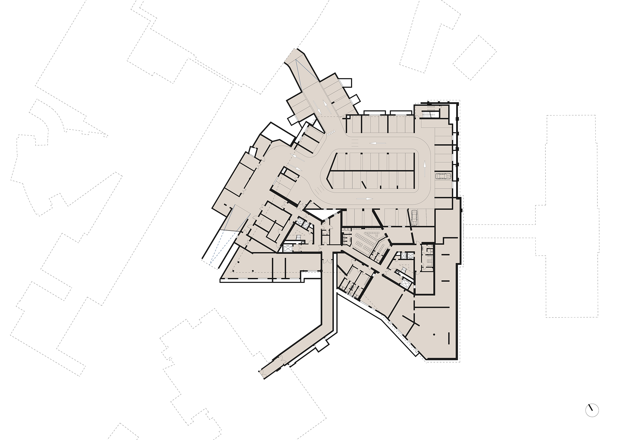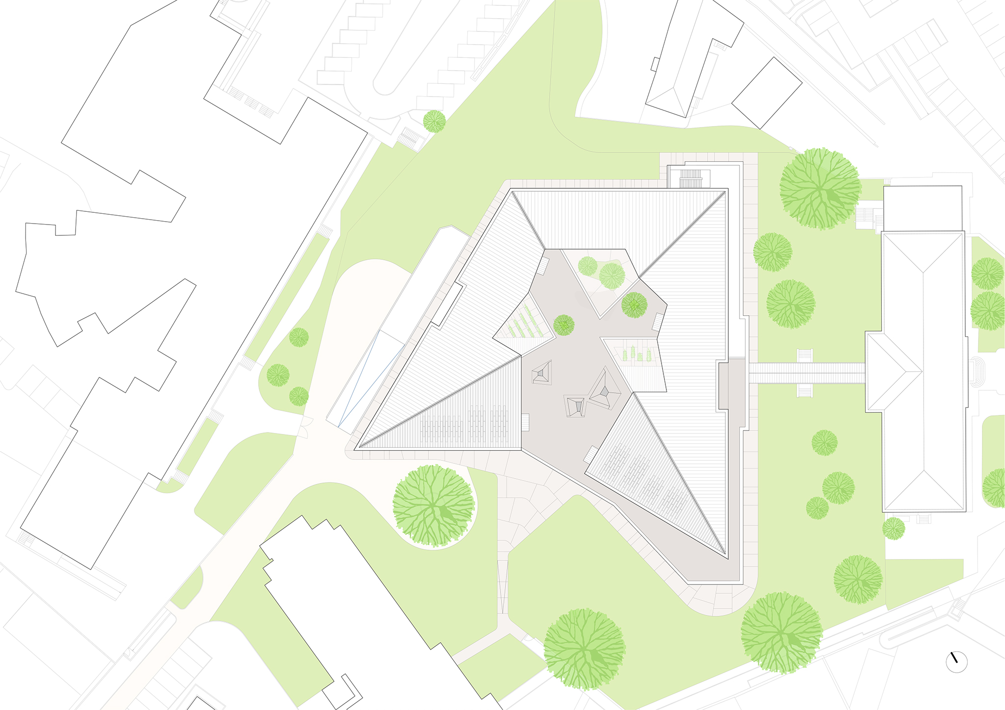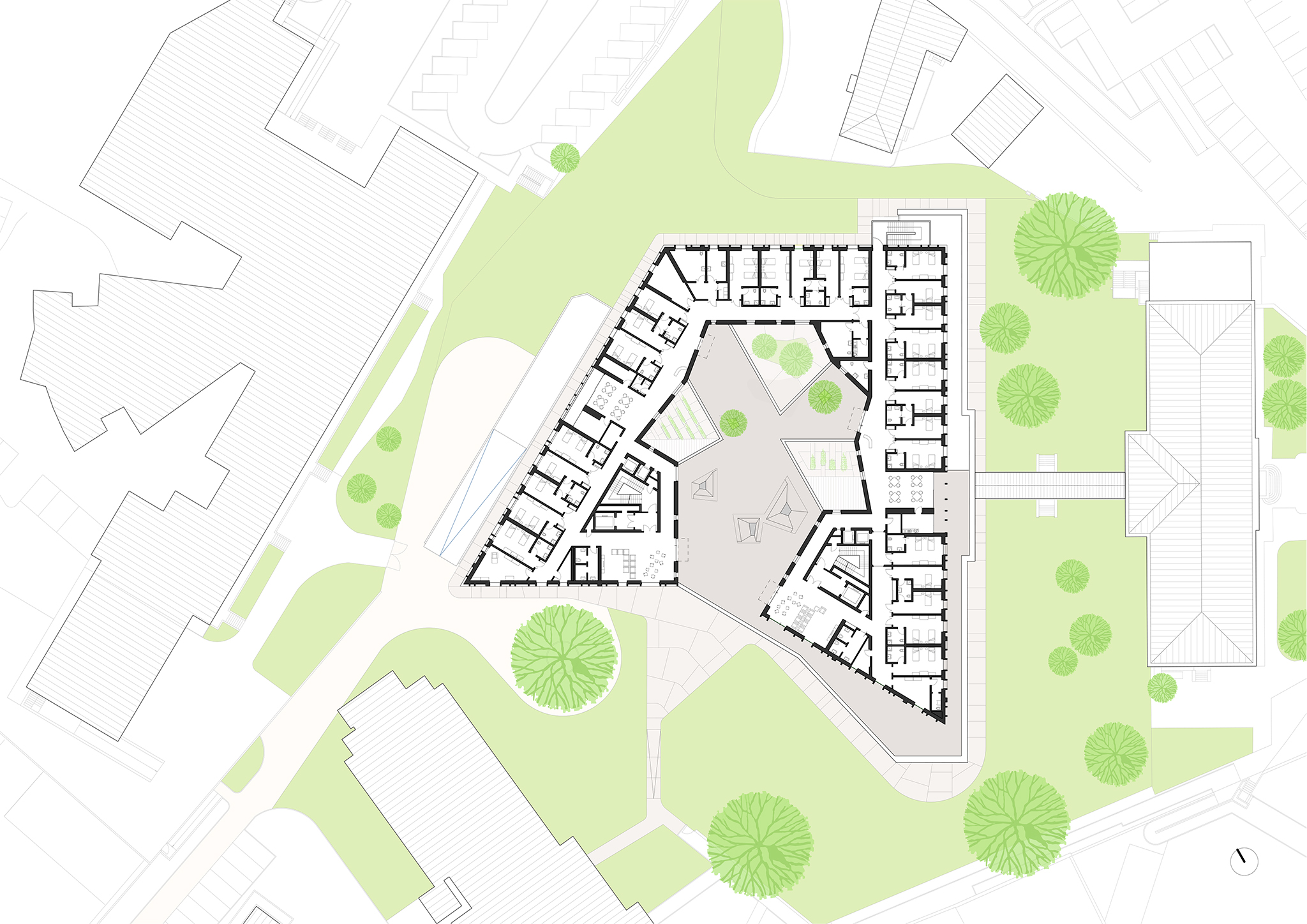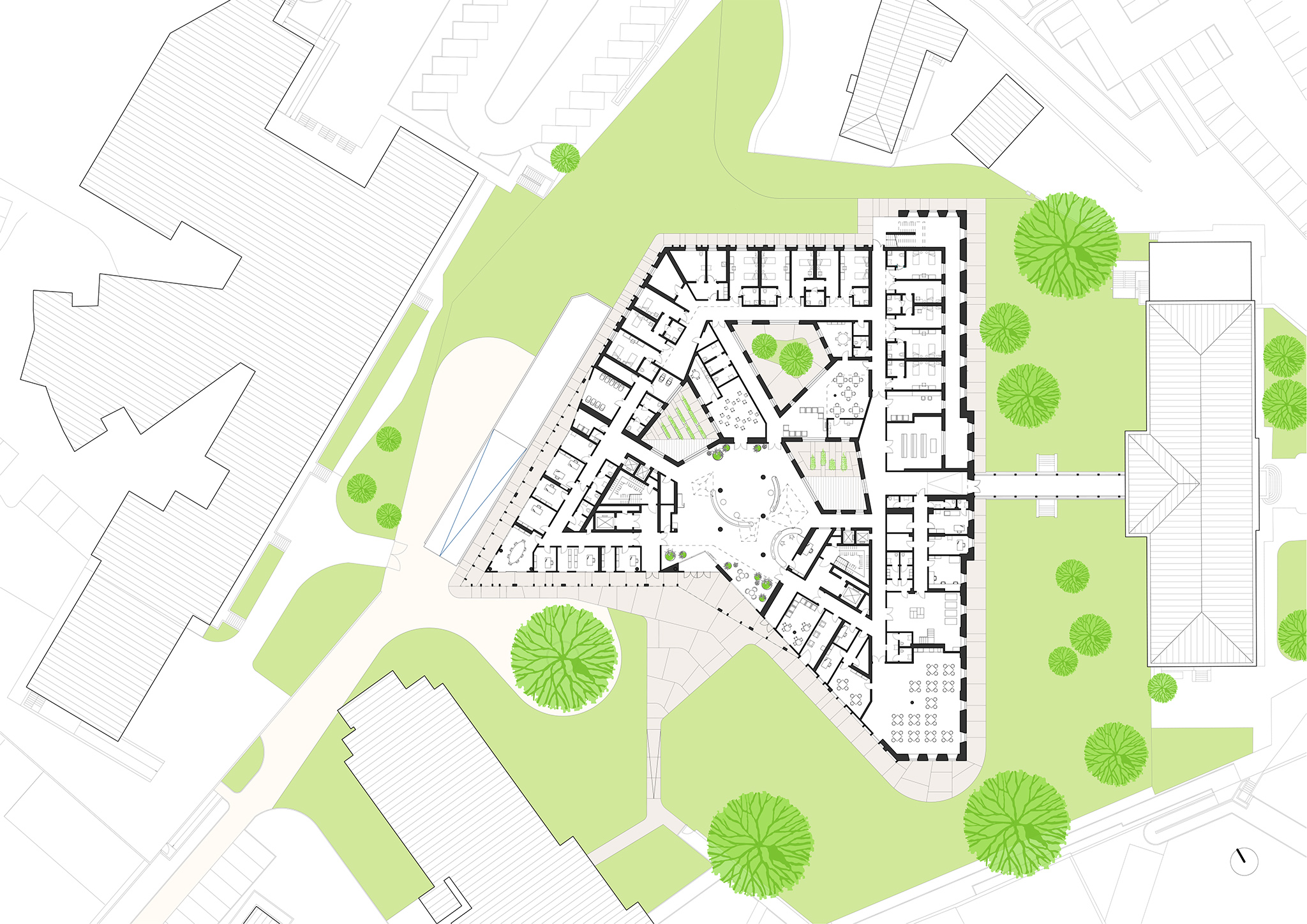 The regeneration project for the former hospital campus, undertaken by Cino Zucchi Architetti, transforms a large public hospital whose facilities had been gradually abandoned over time. The new complex, intended as a retirement home, is organized around a polygonal layout centered on a multi-level inner courtyard. Interior gardens act as a unifying element, organizing the circulation corridors, rooms, and common areas around them.