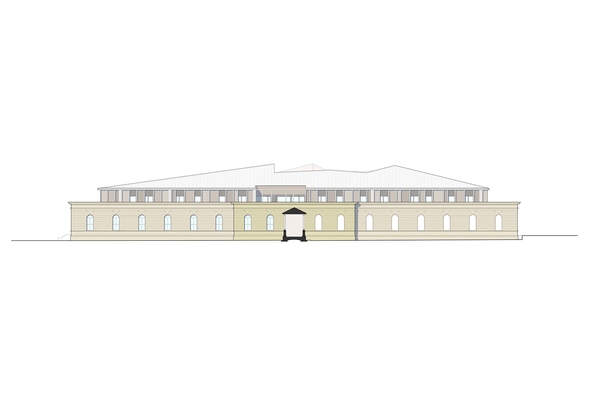On the exterior, the Citadel is wrapped in a structured grid clad in ceramic panels. The façade alternates with slender and large columns, creating a rhythm of panels, windows, and open loggias. This seemingly strict design establishes a dialogue with the neoclassical layout of the former hospital while also recalling the traditional limonaie (lemon houses) typical of the region.