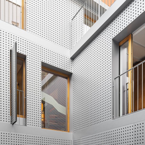 The exterior façade was renovated following classic restoration models, and contrasts with the treatment of the interior façade, where large openings are opened covered with a recycled aluminum skin, perforated and cut by numerical control. The installation of a façade facilitates its maintenance and restoration if necessary, as well as improving the thermal behavior of the house.