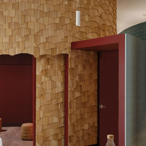 The path is constructed with different materials and textures behind each curve, facilitating the differentiation between spaces and referencing a natural element. The river is lined with blue glazed tiles, simulating water. The walls of the interior spaces are covered with natural cedar shingles, which give off a relaxing aroma and simulate ocean waves.