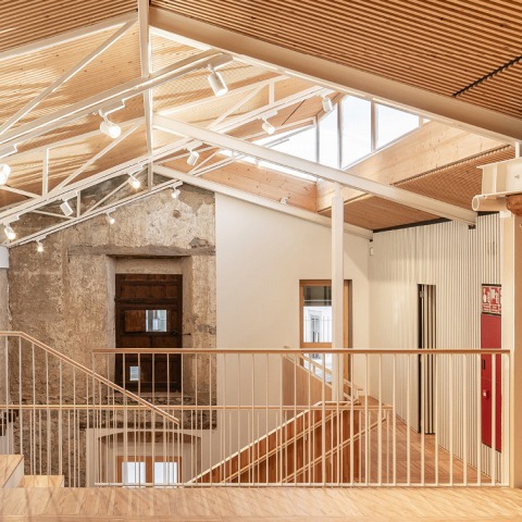 Programmatic changes are made with a new access system and staircases that make the building more versatile. The sumptuous original entrance and the stone staircase leading to the first floor remain on the ground floor. Accessibility and evacuation requirements are resolved with an elevator and the location of a new staircase in the east wing, which provides secondary access that is strategic for the partial operation of the building (multipurpose room P1 and coworking space P2). The main access to the second floor, totally residual in the original construction, now articulates the central space of the building, with a new wooden staircase located in the double-height space illuminated by the skylight.