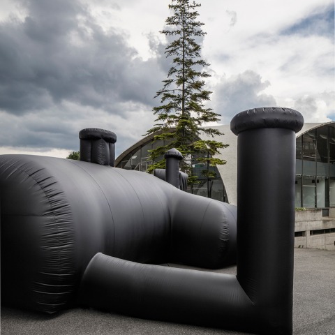 The temporary shelter installation is a dark inflatable bar with a Dj. The whole structure as well as the interior furniture is made out of black PVC membrane. When the party is over the installation is deflated and transported to another location.