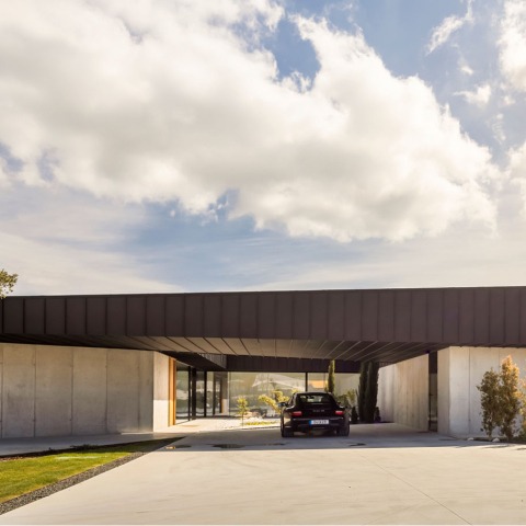 Arriving at the desired address, after passing through the small family industries and between the pine forest of Leiria and the small town of Amieira, with some isolated and disordered houses, I see amidst the green vegetation, at the bottom of the plot, the house, which has an industrial image, which refers to the industrial pavilions in Marinha Grande, but at the same time conveys the comfort, scale, and image of a contemporary dwelling. A large and voluminous metallic canopy, black and dynamic, draws the contours of the house and rests on a glass box that makes it levitate.