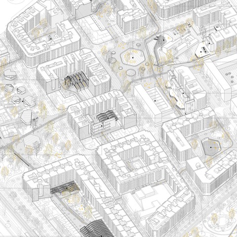 The neighborhood is situated on a outskirts, that is half-vulnerable between the city and the garden. The current situation is a disconnection of the place with its surroundings, the unresolved predominance of the city and the appearance of necessary infrastructures that have been raised without thinking in the landscape and have isolated and cracked the orchard irreversibly.