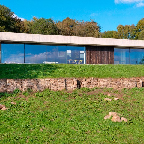 From the outset the surrounding natural environment provided the primary source of inspiration for the proposals. The form of the building is derived from the landscape (the slope, trees, levels and the views) and from the site history. The single storey low lying replacement dwelling is embedded into the site, cut into the slope of the hillside and buried to create an earth shelter which is integrated into the landscape.