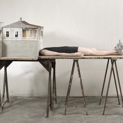 Placed at the intersection of history, memory and fantasy, the work of Andro Wekua (born in 1977, lives and works in Berlin) gives rise to a feeling of disquieting eeriness. He presents here a condensed version of his mnemonic investigations with a sculpture, a film and an environment. The three come together in order to create a feeling of claustrophobia, even dread: Untitled (2011), a wax mannequin with its head encapsulated in a house echoes a short film bordering on science fiction, entitled Never Sleep With a Strawberry in Your Mouth II (2010-2012). In both works someone or something takes possession of your mind. Originally from Georgia in the former USSR—a country he was forced to flee during childhood—Andro Wekua has kept in his work traces of this ‘elsewhere’. His wax figures built to human scale seem to protect themselves from the outside world by the richness of their most intimate thoughts while his paintings refer to the 20th-century avant-garde and his miniature models are memories of the communist architecture of his past.