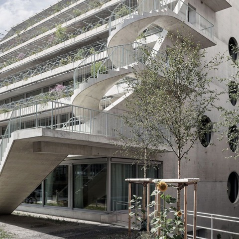 The greening of the building is an important part of the concept. The plants have two functions. On the one hand they are intended to produce a kind of ‘green oasis’ in Binz, a densely developed industrial district where most of the ground is sealed, which aims at improving the users’ subjective perception. On the other hand, the plants help the building climatically by offering protection against the sun and creating a microclimate around the balconies and terraces. Shrubs, bushes and hanging plants are planted directly on the terraces in irrigated planting troughs. In the south plants on projecting trellises provide shade for the floors below, in the north the greenery grows mostly along the railings. The exposed concrete facades on the east and west sides of the building are greened with climbing plants that grow from ground level.