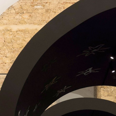 The exhibition space is assumed as a delicate black element that invites its discovery and that stands out from the remaining chromatism of the existing space, without ever overlapping it but without losing its spatial characteristics.