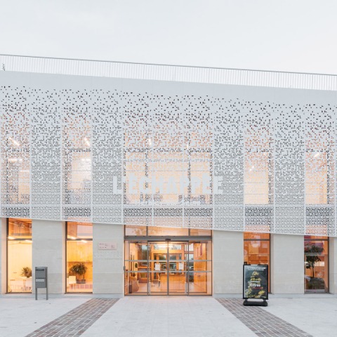 A metal mesh implemented on the north and south facades, along the 3.5-meter-deep outdoor gallery it shelters, allows for the creation of fully glazed facades. The protection provided by the thermocoated perforated aluminum panels moderates the atmosphere of the media library while ensuring a play of shadow and light reminiscent of a forest understory. The building can then take on the appearance of a pleasant refuge during possible heatwaves.