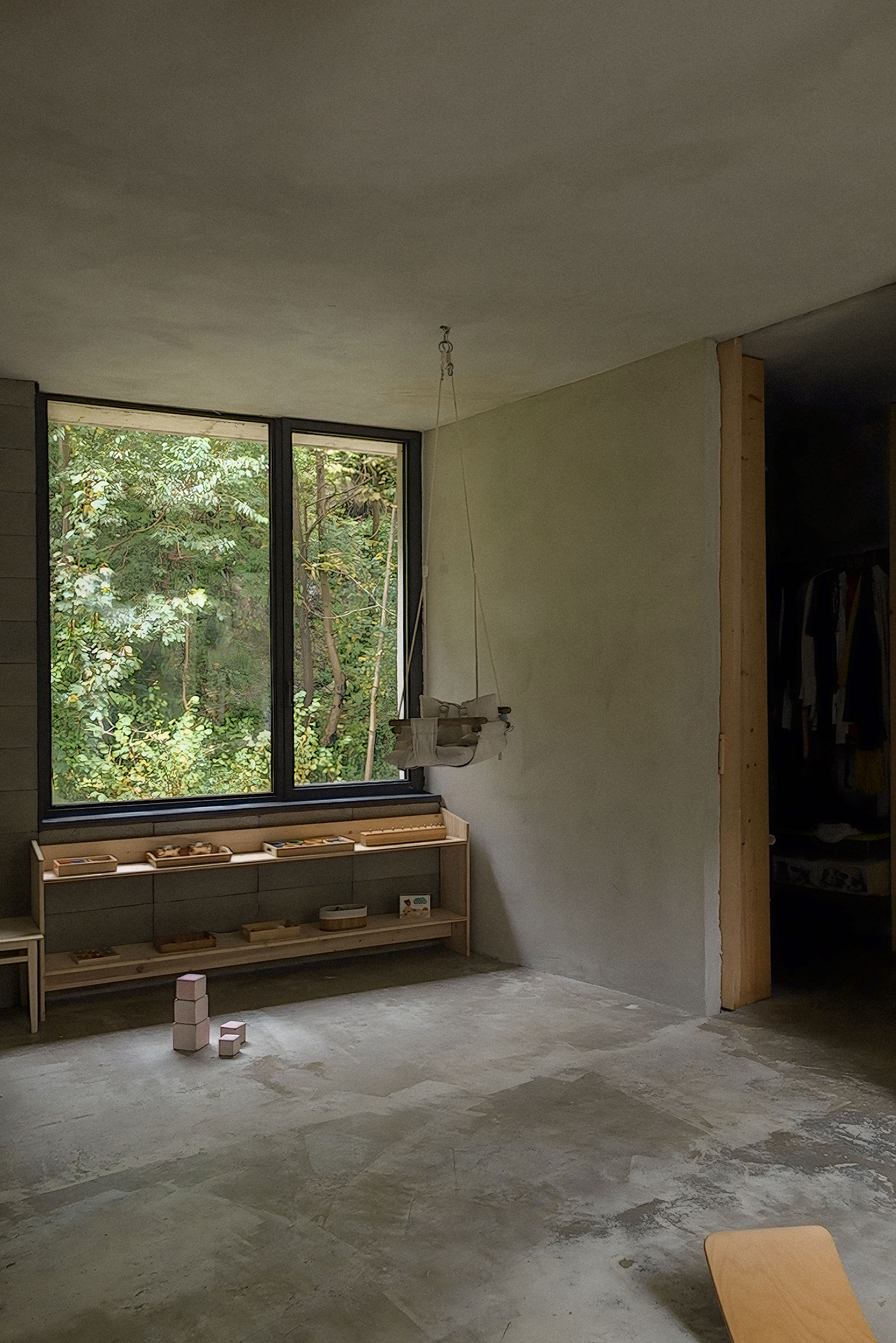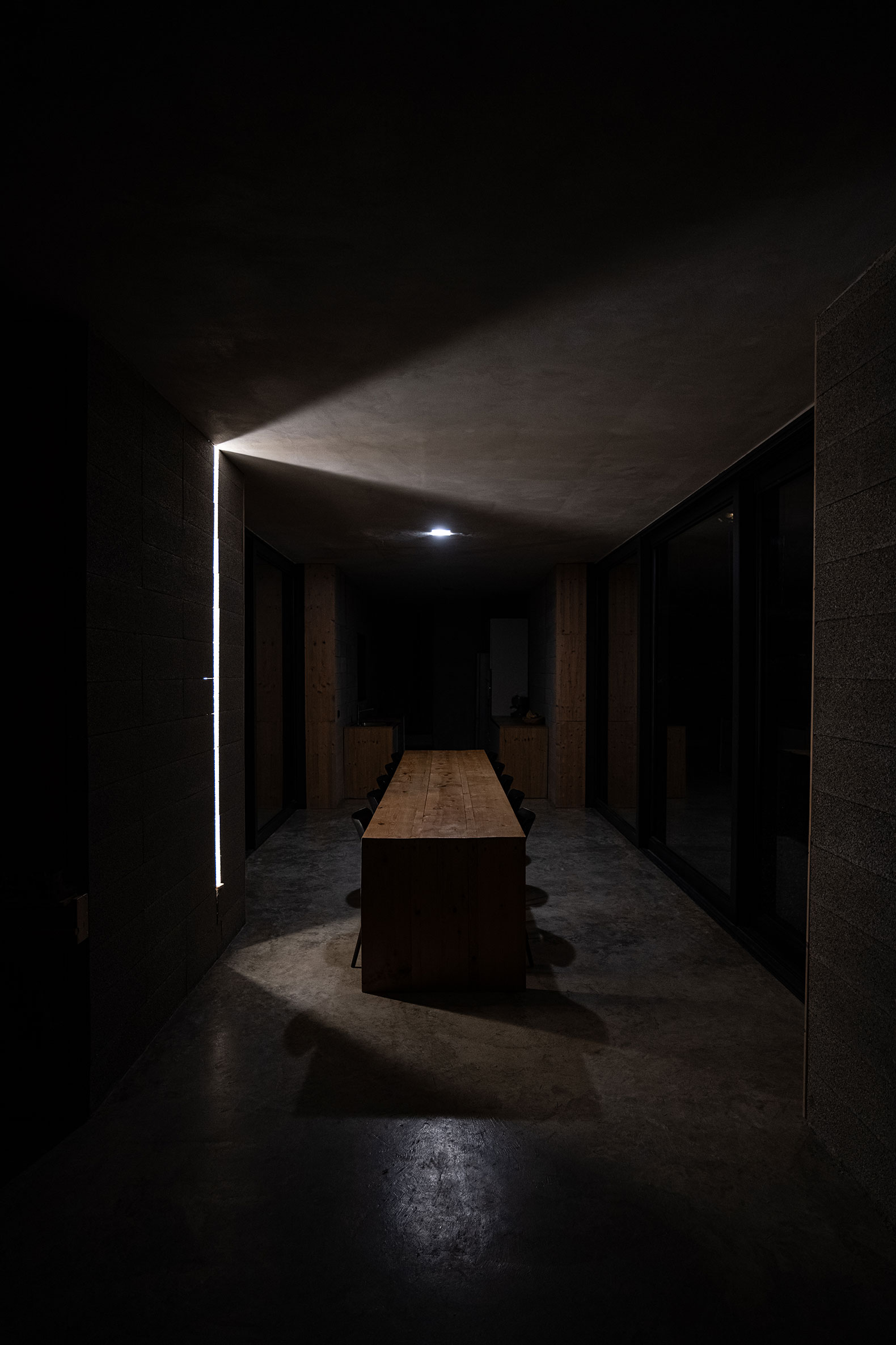 The design of the load-bearing perimeter walls draws from a traditional construc-tion technique using a permanent formwork composed of two EPS (expanded polystyrene) panels. By unbalancing the insulation — increasing mass toward the interior while reducing it on the exterior — the inner layer maintains greater thickness for thermal performance, whereas the thinner outer layer is treated with a release agent. Once the concrete is poured, this thinner formwork can be dismantled and reused on the roof, leaving exposed architectural concrete walls.