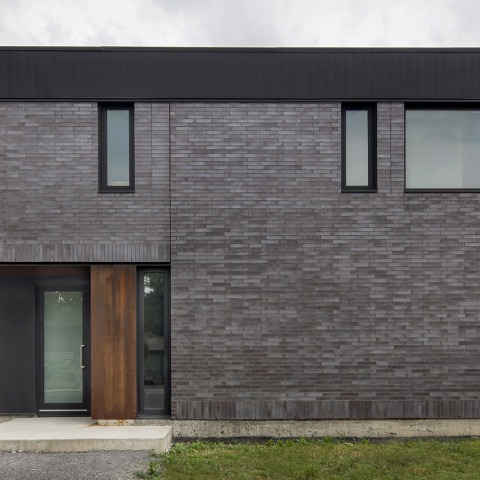 The black metal cladded garage box is recessed from the front façade creating a loggia entrance; it sits perpendicular to the street. The day room box is thinner than the second floor, parallel to the street and open to the backyard. Above the night box overhangs the lower floor and holds the bedrooms. These principal boxes are cladded with ash berry velour brick forming a “T” shape front façade. Finally, inside the vertical black steel cladded box, a den and a family room sit on split-levels.
