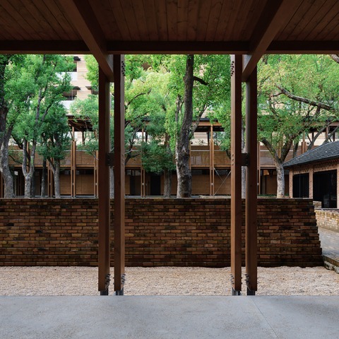 The Jingyang Camphor Court creates a tranquil courtyard in the heart of Jingdezhen (Jiangxi province), a city historically well-known for its porcelain production. The site is located in a bustling part of the city and characterized by the presence of ongoing industrial heritage renewal projects around it. The site featured industrial relics such as a long and narrow industrial building, a few mechanical rooms, a dormitory, and a dilapidated pavilion. In and around these structures, camphor trees had grown to maturity. The retention of these trees became the basic premise of the project.