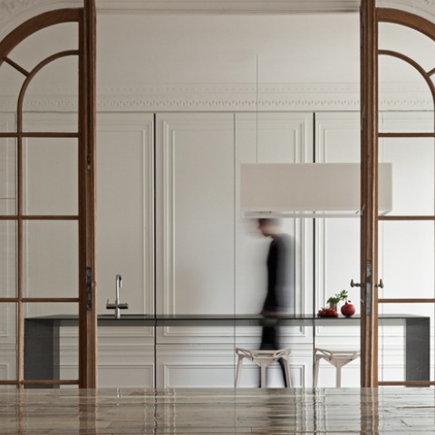 In the case of this apartment in Paris, where the kitchen concept is installed, an existing profiled wall is exactly copied on the front panels in order to integrate the solid volume with the monumental space. The freestanding kitchen island is placed in front of the panelled sliding doors.