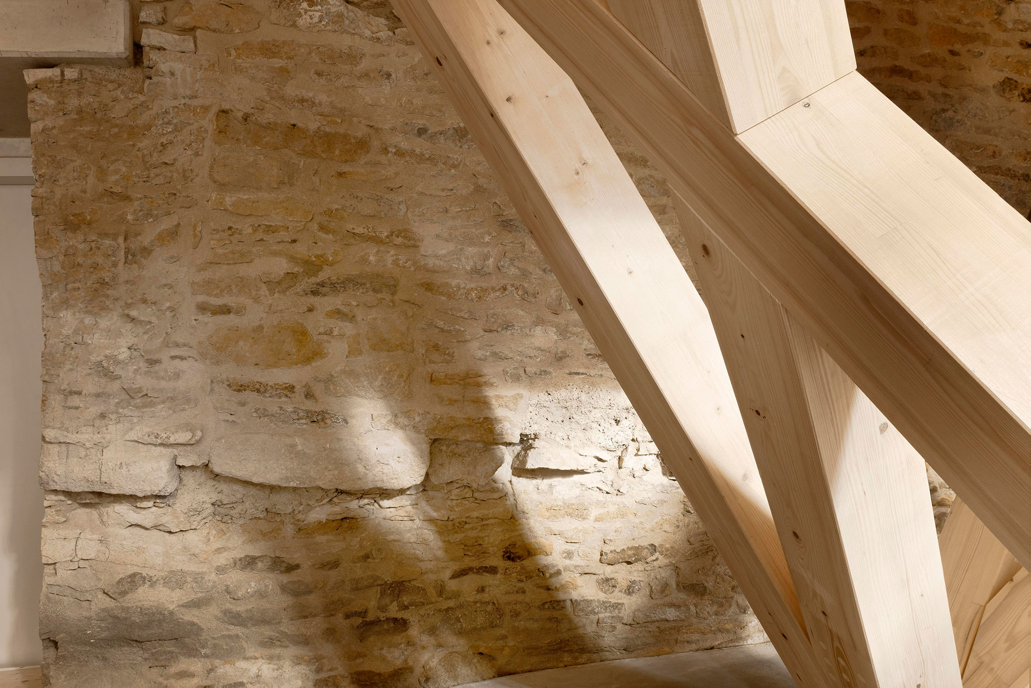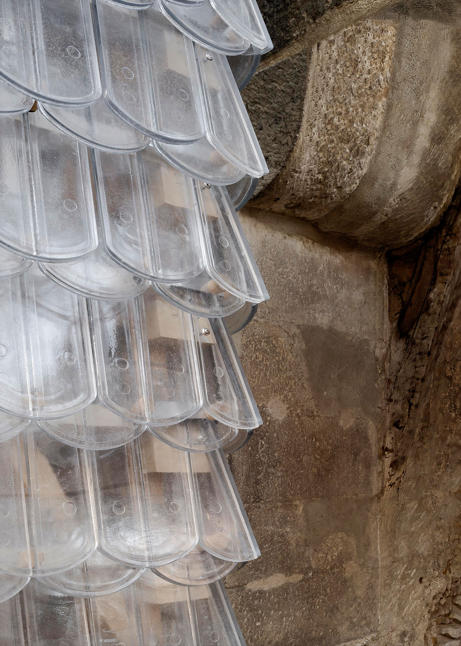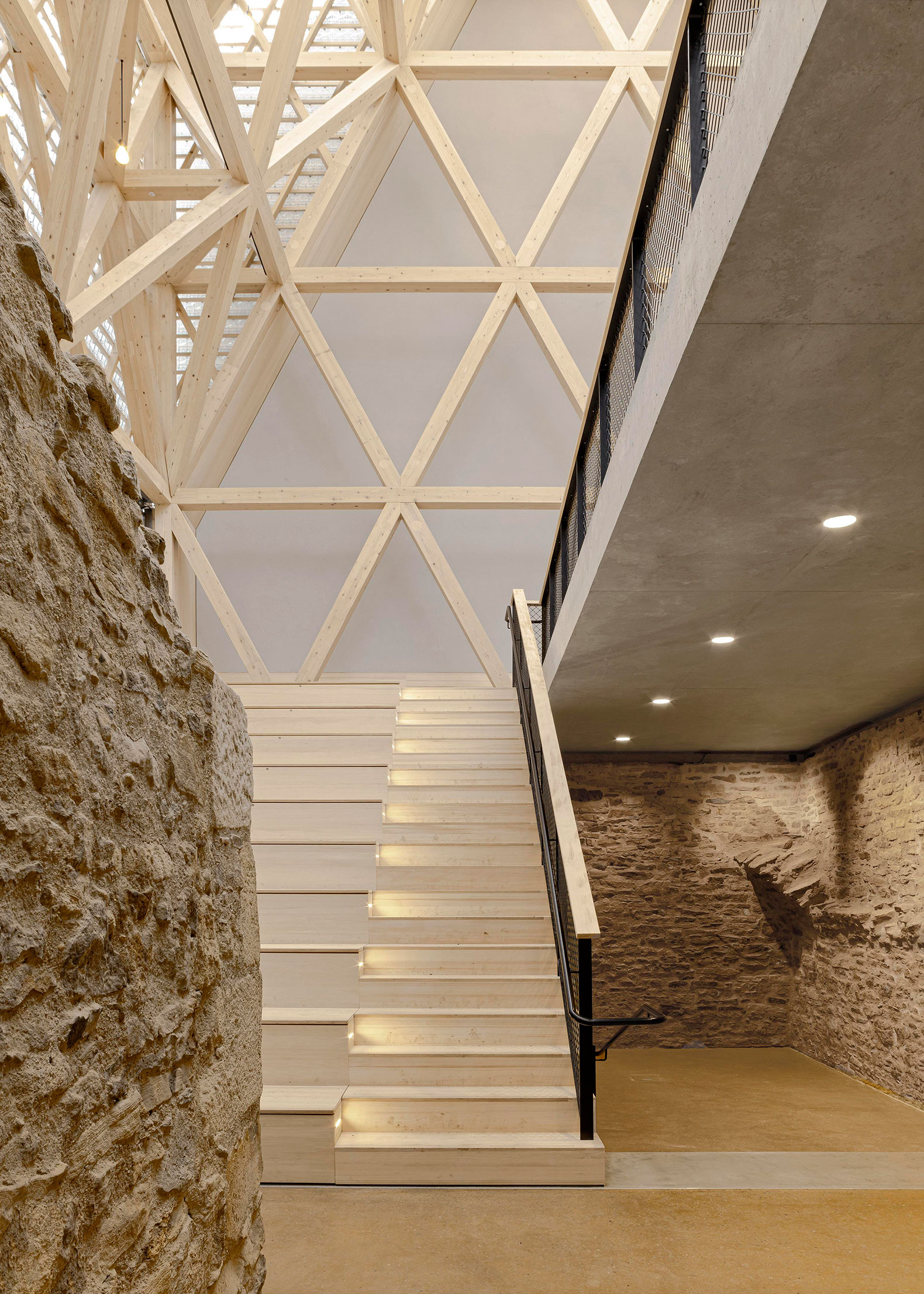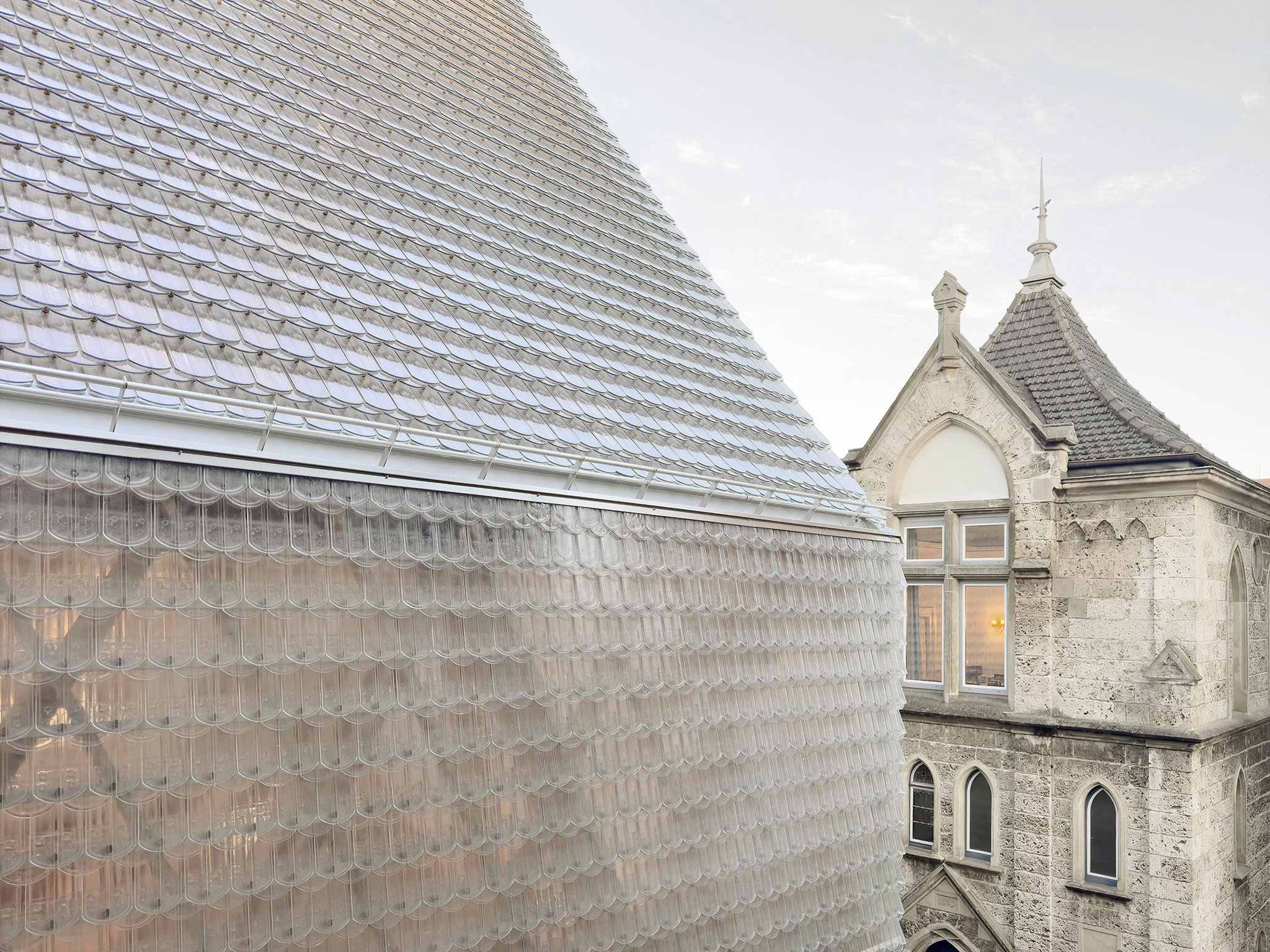 The rehabilitation, which follows historic preservation criteria, has also required the construction of a new corner building where the former “Stone House” once stood, which shores up the surviving historic ensemble and protects it from collapse. The old buildings serve as a museum and are themselves exhibits, displaying over 700 years of urban, cultural, and architectural history. The new building’s outward appearance is restrained. The internal structure consists of wooden trusswork that braces the adjoining row of houses and reestablishes the lost form of the historic house. The new building facilitates barrier-free access to the old buildings and provides space for small events. The roof and facades are clad with a homogeneous layer of cast-glass “beaver-tail” tiles. Depending on the conditions of incident light, reflection, and interior lighting, the wooden trusswork behind it is more or less visible, and the building appears diaphanous and iridescent – giving it a mysterious quality, like a chimera. The newly designed outer skin makes the interior seem blurry, like a distant memory. Something that persists in the memories of those who still knew the old house is made visible again for future generations.