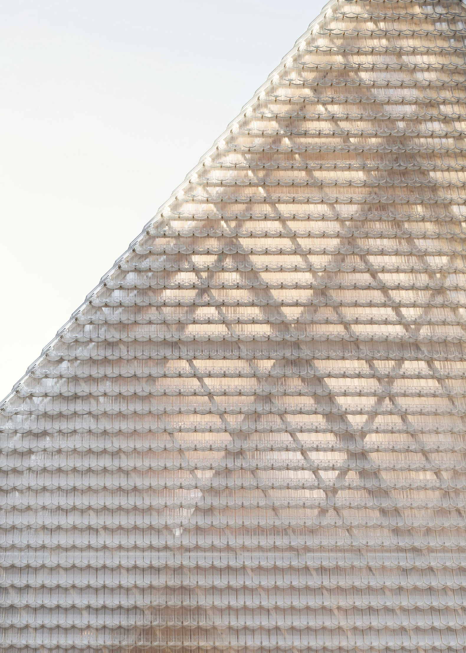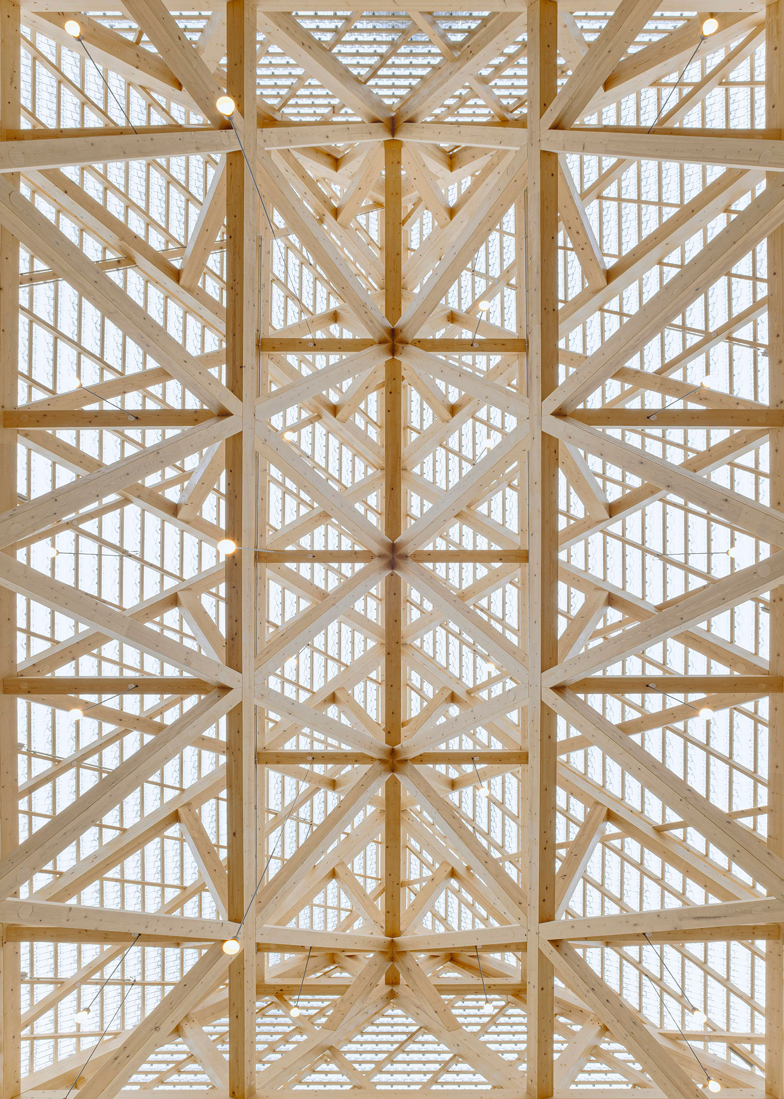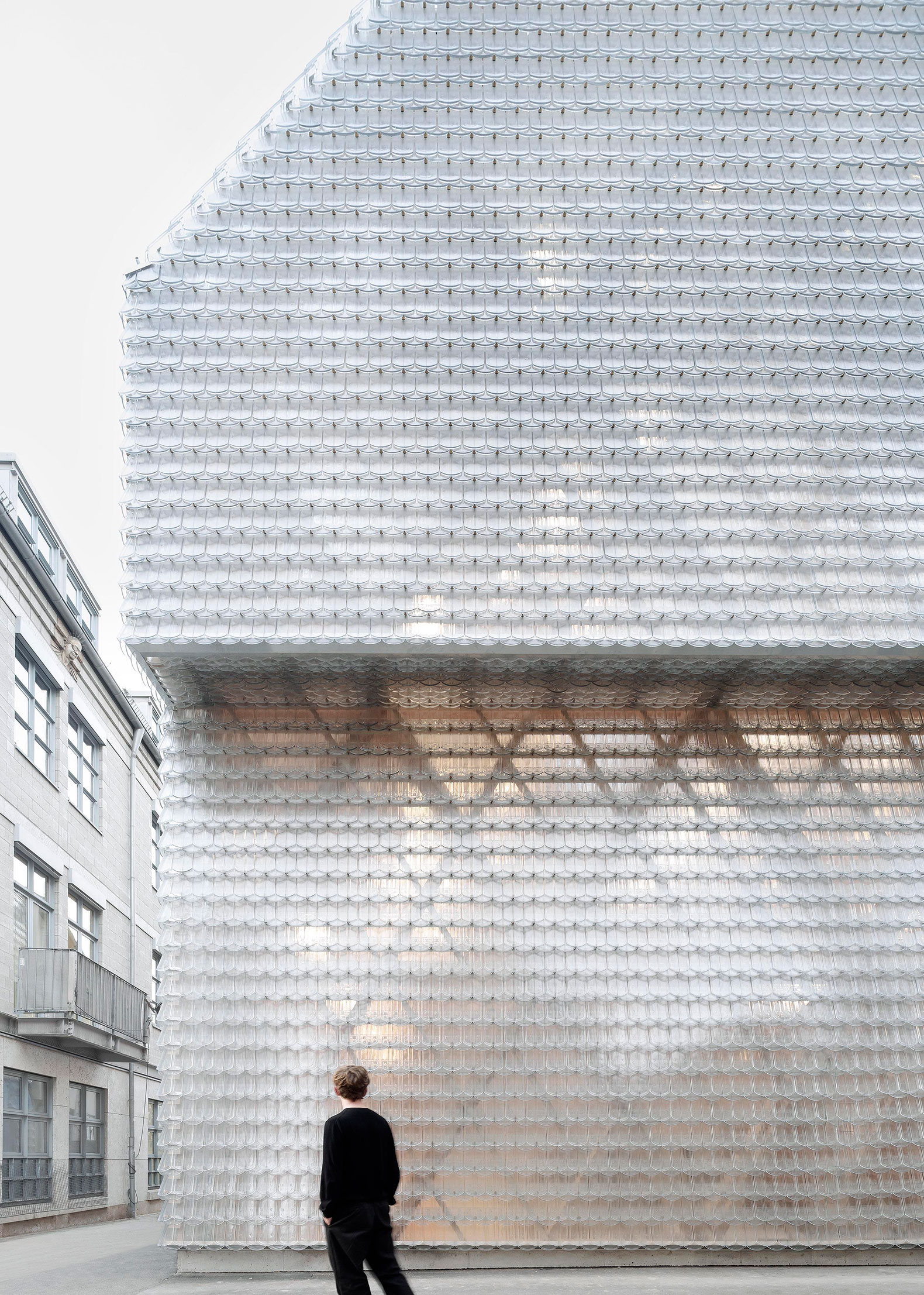 The load-bearing timber structure was developed parametrically and features a triple-layered substructure of diagonally and horizontally overlapping timber elements that support the cast glass tiles with a beaver-tail shape, which envelop the building. Depending on the natural light and interior illumination, the timber truss becomes more or less visible, giving the whole an appearance of a mysterious chimera. Open joints in the façade allow for natural ventilation and smoke extraction.