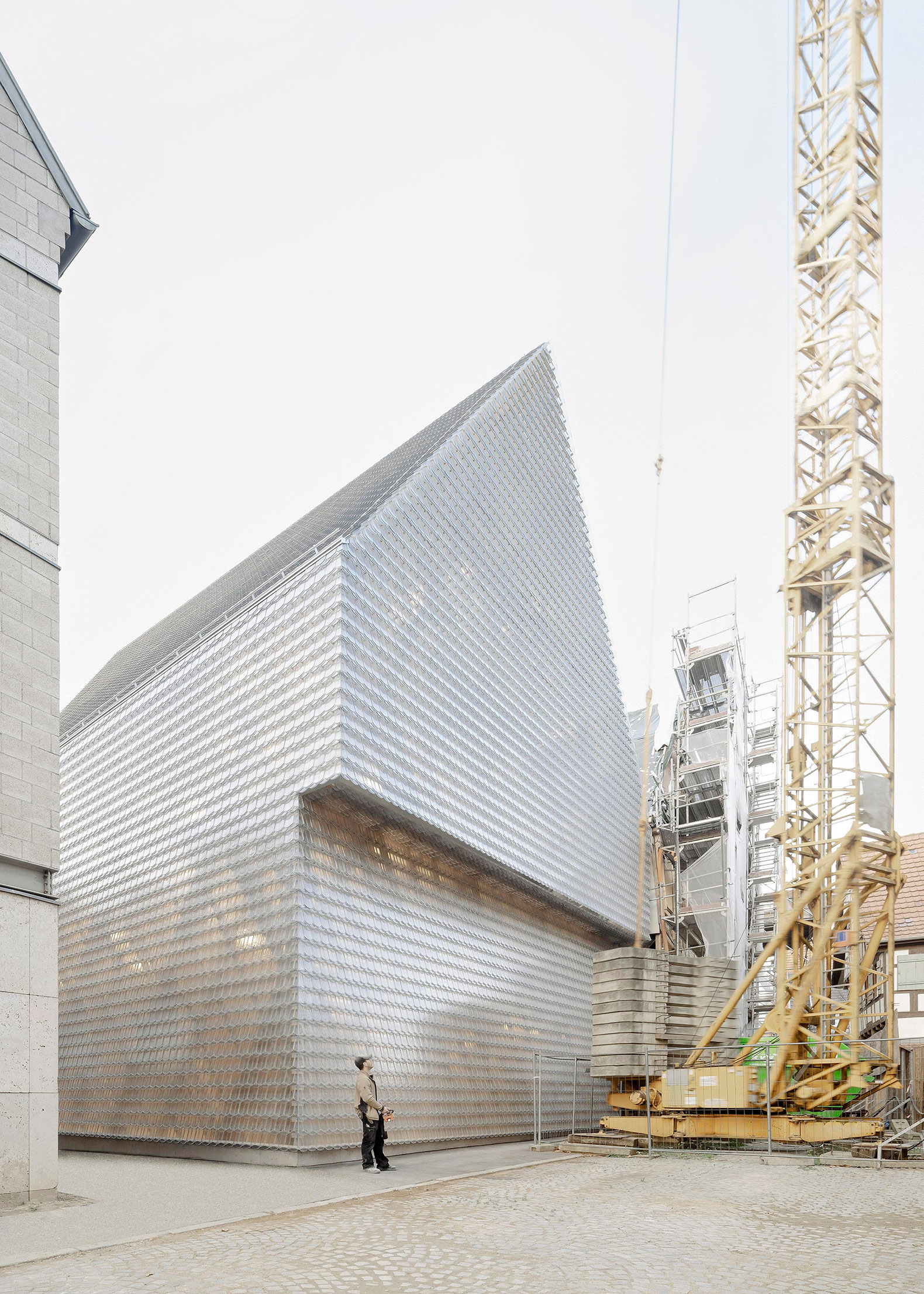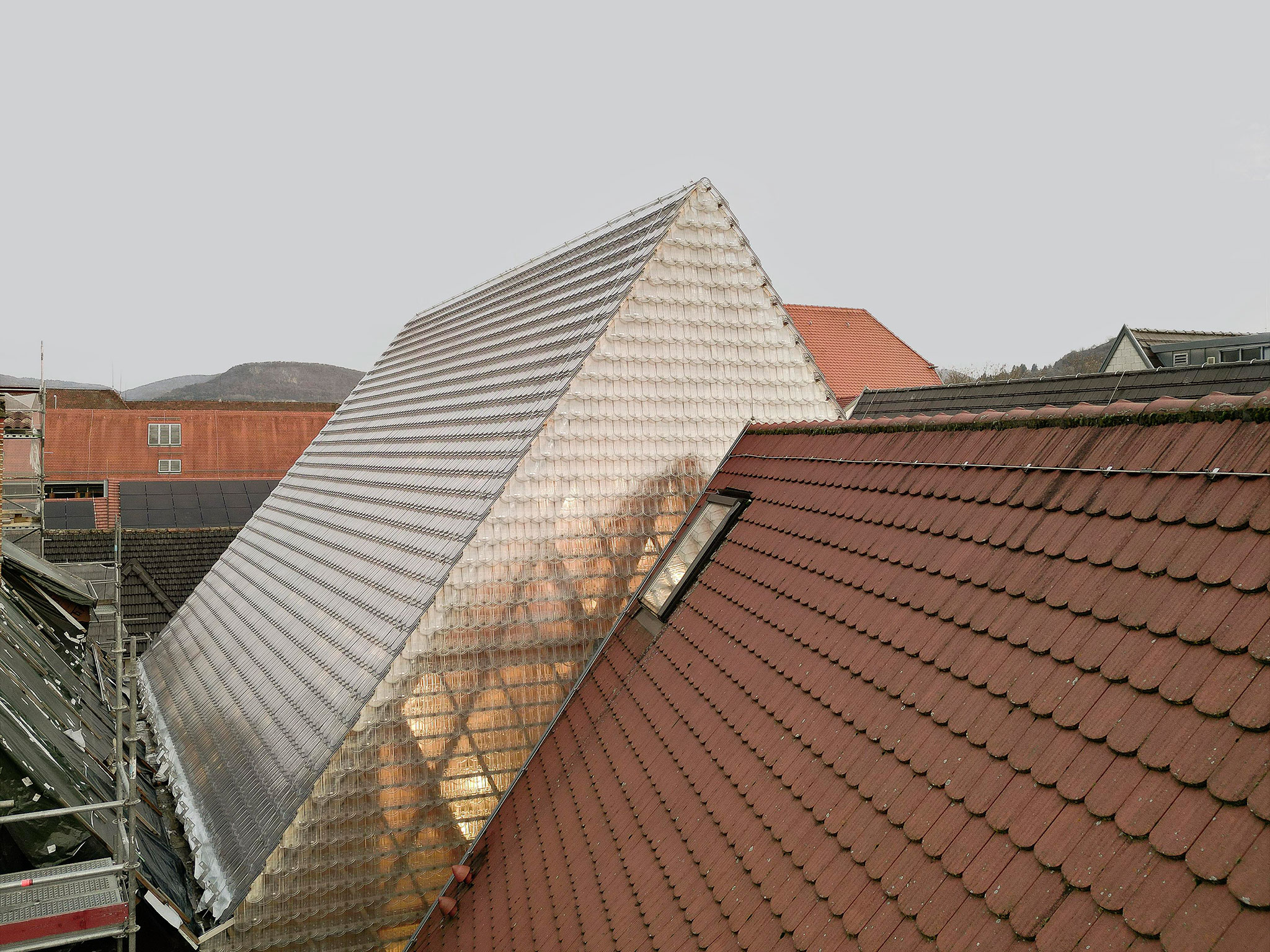 The new building’s geometrically complex, load-bearing wooden structure was developed parametrically. The architectural requirements and constructive logic align precisely. A triple-layer, gradually dissipating substructure of diagonally and horizontally overlapping wooden members carries the glass beaver-tail tiles as external cladding for weather protection. No thermal insulation or air conditioning is required in the new building, which also serves as a protective enclosure for the historic cellar. Open joints along the entire exterior of the building provide natural ventilation and smoke extraction. The building was designed for circularity in accordance with the Cradle to Cradle (C2C) design and sustainability concept. Thus, all connections are screwed together so they can be easily disassembled. Concrete was generally avoided and only used where structurally necessary. The Historical Oberamteistraße Museum project is supported by the federal program “Nationale Projekte des Städtebaus” (National Urban Development Projects), enabling it to preserve and upgrade one of the oldest rows of half-timbered houses in southern Germany.