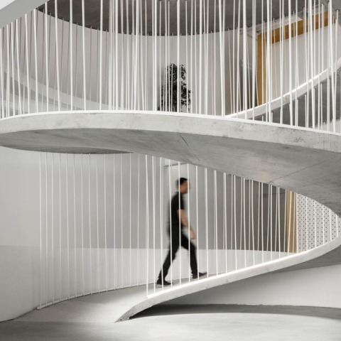 In order to guarantee a fluid and natural relationship between floors, we have designed a concrete spiral with a strong sculptural character, which interconnects the three floors and by its presence characterizes the whole space. At the top a skylight illuminates the three floors and leaves uncovered the structure of reciprocated bars supporting the ramp, elegantly proposed by the engineer.