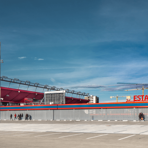 The exterior image of the stadium is characterized by having a baseboard in neutral colors based on precast concrete elements and perforated folded steel plates; that contrasts with the surrounding of red metallic trays on the upper floors. On the main façade of the grandstand, the dynamic façade is developed, a light second skin based on circular anodized aluminum discs the diameter of a soccer ball.
