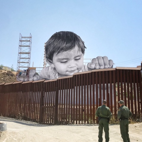 JR inaugurated last week a huge scaffolding installation on the Mexican side of the border between the United States and Mexico. The piece is best viewed from the US side of the border. An immense image of Kikito, a one year old boy from the city of Tecate, looks playfully over the infamous border wall. Kikito and his family cannot cross the border to see the artwork from the ideal vantage point.