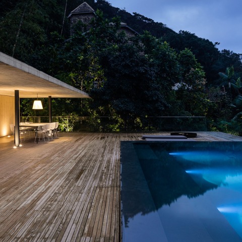 This last floor offers a spatial sensation which synthesizes the principles of the house: on one side, there is a deck which houses the hot tub and the sauna – where there is an intense relation between the architecture and the mountain and its vegetation; on the other side, a ground fireplace and the pool; in the center – between these two free spaces – is the living room open to both sides and with cross-ventilation. This social space has a radical relation with nature, by means of both the view of the ocean as well as the proximity to the forest in the mountain.