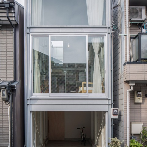 This narrow house for a couple and their little child is located in a densely built-up area of Osaka, Japan. The size of the site is only width 3.4m and depth 13m.To make full use of it, the house is framed in exposed structural steel, covered with thin fire-resistant adiabatic panels, and contains six floors with split levels. Lv.1 (basement level) is a bedroom, Lv.2(ground level) is a garage, Lv.3 is for the little girl, Lv.4 is a living space, Lv.5 is a bathroom, and Lv.6 is a roof terrace. The expanded metal stair connects each floors and spreads the sun light inside. In this house , they are living like birds swinging from branch to branch.