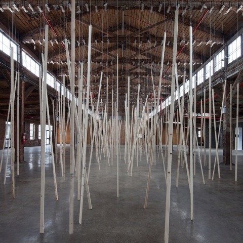 At Knockdown Center in Queens, Zimoun is building a newly commissioned immersive environment of 250 motorized wood beams and ropes. Each unit will cyclically strike the floor, producing a sonic experience reverberating within a 10,000 square foot atrium space with 40-foot ceilings. Unveiling on Saturday February 7th, the installation marks Zimoun’s largest site-specific project in the US to date. On opening night, Zimoun will also present a rare live performance that will inaugurate a new series of cross-disciplinary programming at Knockdown Center responding to its unique architecture and history.